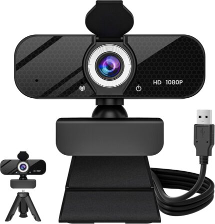 1080P HD Webcam with Built-in Microphone, Rotatable Tripod, Wide-Angle Lens,Privacy Cover, Auto Light Correction, Plug & Play USB-A Webcam for Laptop, Desktop, PC, Streaming-Black